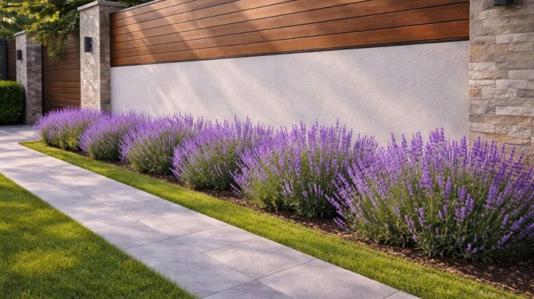 A lavanda introduz leveza e perfume ao canteiro, criando uma atmosfera suave e convidativa. Suas flores em tons arroxeados contrastam delicadamente com muros de pedra, tijolo aparente ou superfícies claras, enriquecendo a composição com cor discreta.